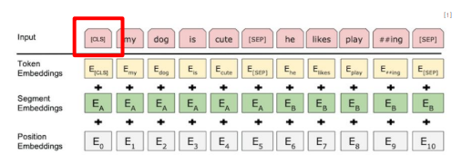 - 모든 문장의 첫 번째 토큰은 항상 [CLS] 토큰 - Encoder layer를 거치면서 나머지 토큰들의 정보를 바탕으로 임베딩 생성 - 마지막 인코더 층을 통과한 후 [CLS] 토큰 출력 값을 통해 classification task 수행 [SEP] 토큰