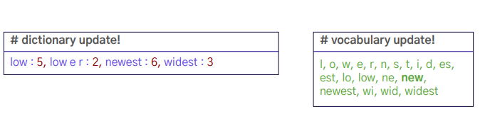 Byte Pair Encoding (BPE) 알고리즘 - 연속적으로 가장 많이 등장한 글자의 쌍을 찾아서 하나의 글자로 병합 - 글자 단위에서 점차적으로 단어 집합을 만들어 내는 Bottom up 방식