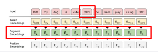 - 서로 다른 문장으로 구별하기 위한 토큰 - Question answering task 같은 경우 질문과 답이 이어지는 문장이 아닌 서로 독립적인 문장으로 인식할 수 있게 해줌 - [SEP] 토큰 뿐만 아니라, segment embedding 층을 통해 추가적인 정보 주입