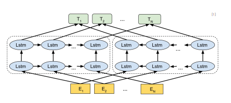 - 2개의 층으로 이루어진 순방향 LSTM 뿐만 아니라 역방향 LSTM을 독립적으로 학습하는 언어 모델 - 위쪽에 위치한 LSTM은 단어의 문맥 정보를 학습 - 아래쪽에 위치한 LSTM은 단어의 문법 정보를 학습