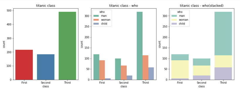 ax3.set_title('titanic class - who(stacked)')