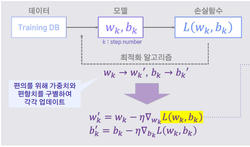 딥러닝 파이프라인 - 모델이 데이터를 통해 추정한 값( )이 정답/목표( )와 최대한 가까워지도록 ( = 손실 함수의 값이 최소가 되도록 ) 파라미터( )를 최적화 알고리즘을 적용하여 최적의 모델 파라미터( )를 찾는 과정