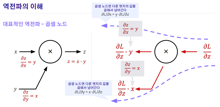 - 역전파 : 각 노드에서의 편미분을 이전까지의 결과에 곱해서 뒤로 전달