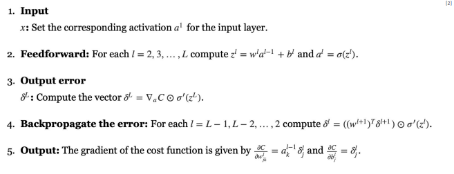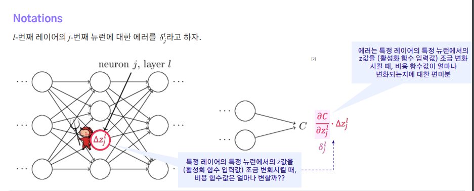 역전파의 기본 방정식 1. for the error in the output layer, 𝜹^L 2. for the error in the l-th layer in terms of the error in the next layer (l+1), 𝜹^𝒍 ↔ 𝜹^𝒍+1 3. for the rate of change of the cost with respect to any bias in the network 4. for the rate of change of the cost with respect to any weight in the network [ Insight 1 ] Low-activation neurons : 만일 뉴런 a가 활성화된 정도가 작다면, 관련 가중치의 변화가 비용 함수 C의 변화에 거의 영향을 주지 않음 [ Insight 2 ] Saturated neurons : 출력층에서의 출력값이 거의 0 또는 1인 경우, 관련 뉴런의 가중치 및 편향는 느리게 학습. -> 이미 잘 맞추는 문제는 더 이상 풀지 않는 것과 유사함