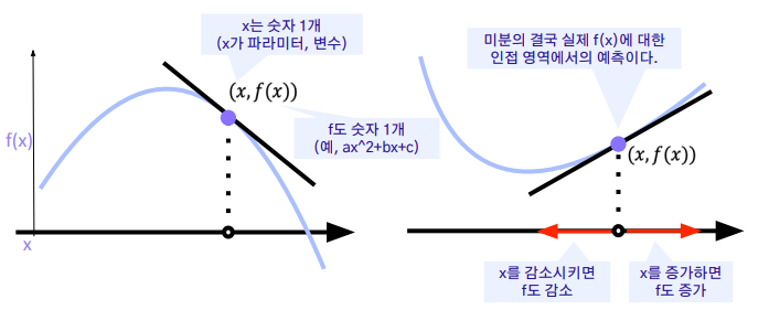 - x에서의 미분값은 함수 f 의 주어진 점 (x, f(x)) 에서의 접선의 기울기와 동일 - 어떤 점에서의 함수의 기울기를 알면 어느 방향으로 점을 움직여야 함수값이 증가or 감소하는지 알 수 있음 - 미분값의 반대 방향으로 가면 감소!! x → x – f '(x)